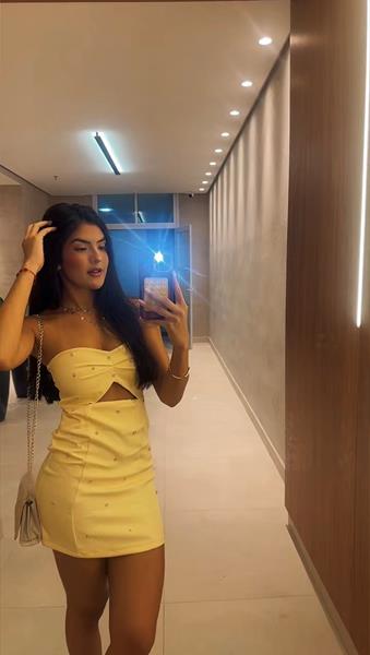Vestido tomara que caia, amarra atrás e tem zíper.